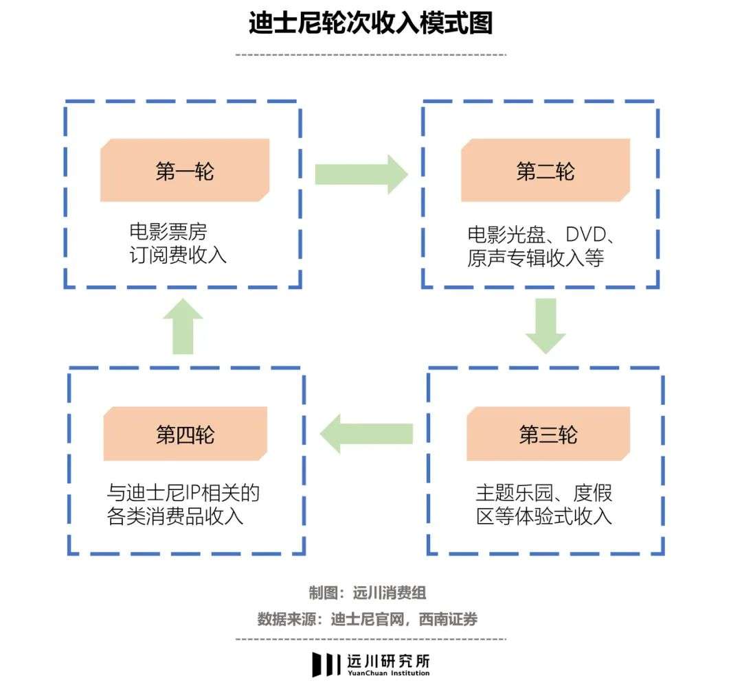 迪士尼IP变现的链条上大致可以总结成四个轮次:院线、拷贝销售录像带、主题乐园门票以及周边产品[3]。