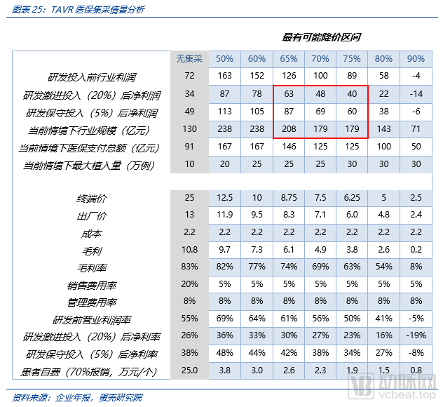 如果医保降价幅度为当前均价70%,则行业规模仍然可达179亿元,且研发投入前行业利润可能超过100亿元,激进研发投入假设下,行业利润可达48亿元。我们对于医保集采后,行业规模和企业的利润进行了情景分析和压力测试。如果医保集采并降价70%,则患者自费部分金额将从20万元降低到2万元,几乎可以实现TAVR手术的全患病人群覆盖(假设25万手术量),行业规模可达179亿元。虽然行业毛利率从83%下降至69%,下降14个百分点,但同时销售费用率从集采前20%降低到5%,对冲了毛利率下降带来的净利率影响。