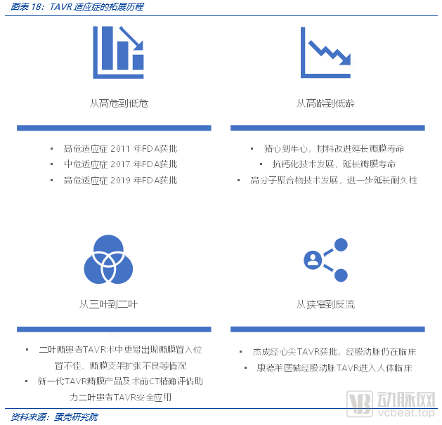 第二层面:从治疗指南和专家共识角度,TAVR适应症不断扩大。最早美国指南对TAVR的使用要求是外科高危人群,如今逐渐向外科手术中低危拓展。初始由于瓣膜的耐久性有限,医生仅对高龄老人植入人工瓣膜。而现在瓣膜耐久性在临床中不断得到积极的验证,相对低龄患者也能够行TAVR。TAVR形成对SAVR(外科手术)的替代竞争。解剖学上,二叶式主动脉瓣(BAV)在我国的患者中非常常见。二叶瓣患者具有瓣叶钙化严重且不均匀、瓣叶大小不对称、合并升主动脉疾病等问题,手术过程中容易导致瓣膜置入后移位、瓣周漏、冠状动脉堵塞、瓣环破裂、主动脉夹层等并发症发生。因此二叶瓣是早期TAVR指南的相对禁忌。而我国的二叶瓣患者较多,随着手术经验的积累,这一禁忌已逐渐被打破。二叶瓣不再是TAVR的禁忌。