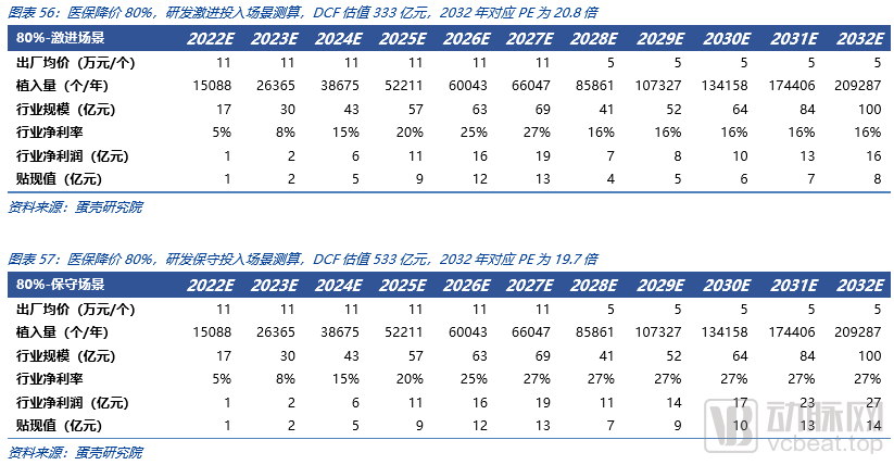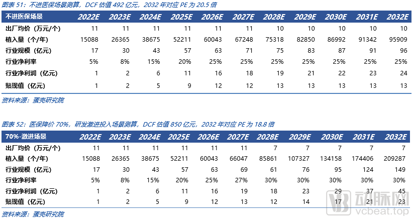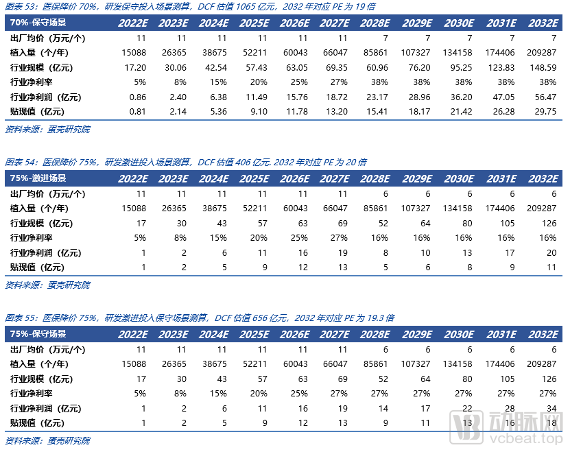 对于TAVR赛道的DCF估值涉及到的现金流的预测关键假设包括:植入量及其增长、平均单价及其变化、医保集采的时间及其力度、研发投入力度及净利润率。我们假设医保集采在2028年发生(最佳猜测),分别按照终端价下降70%、75%、80%进行情景分析。并对75%、80%降价幅度情境下分别进行了保守研发投入/激进研发投入两种情况进行了细节分析(假设激进研发投入研发费用率20%,保守研发投入研发费用率5%)。纳入医保集采后我们假设当年植入量有30%增长。