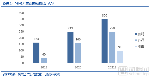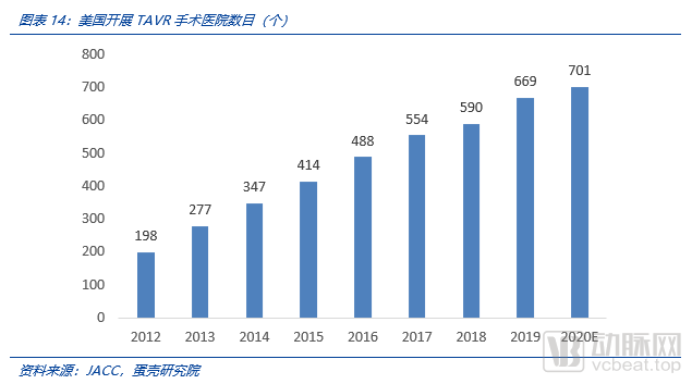 2019年已开展TAVR手术医院数量超过164家,2020年超过249家,2021年预计可达350家,仍远低于可开展TAVR手术医院的总数量。我们认为,在3年期内开展TAVR手术的医院数目将继续保持每年100家以上的增速。