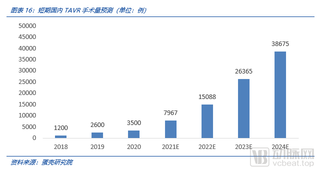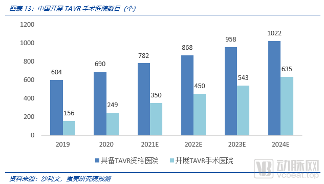 每年超过 400 例冠脉支架手术(PCI手术)的医院被视作具备TAVR手术资格的医院。预计具备TAVR资格的医院将从2019年的604家,增长至2024年1022家。