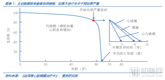 (1)主动脉瓣狭窄危险性高,若不及时手术干预,则严重影响生存期。主动脉瓣狭窄使左心室向主动脉排血的阻力增加,可引起呼吸困难、心绞痛、昏厥等典型临床表现,若不进行治疗,患者病情进行性加重,可危及生命。主动脉瓣狭窄预后与主动脉瓣狭窄的严重程度有关,有症状的主动脉瓣狭窄患者出现心绞痛时若不换瓣,中期生存期为5年;出现晕厥时,中期生存期为3年;出现呼吸困难时,中期生存期仅为2年。PARTNER研究显示,对于不适合进行外科手术的重度钙化性主动脉瓣狭窄患者,经保守治疗后(不进行手术),1年死亡率达50.7%。对于无症状的重度主动脉瓣狭窄患者,大部分5年内会出现症状,年猝死率为1%。