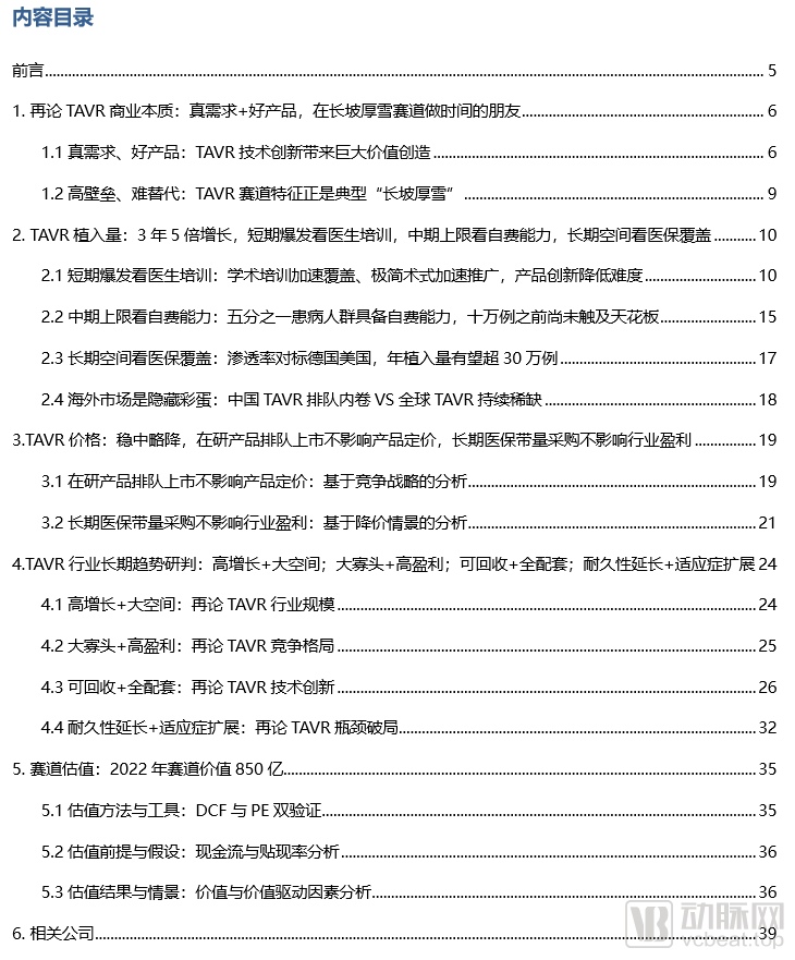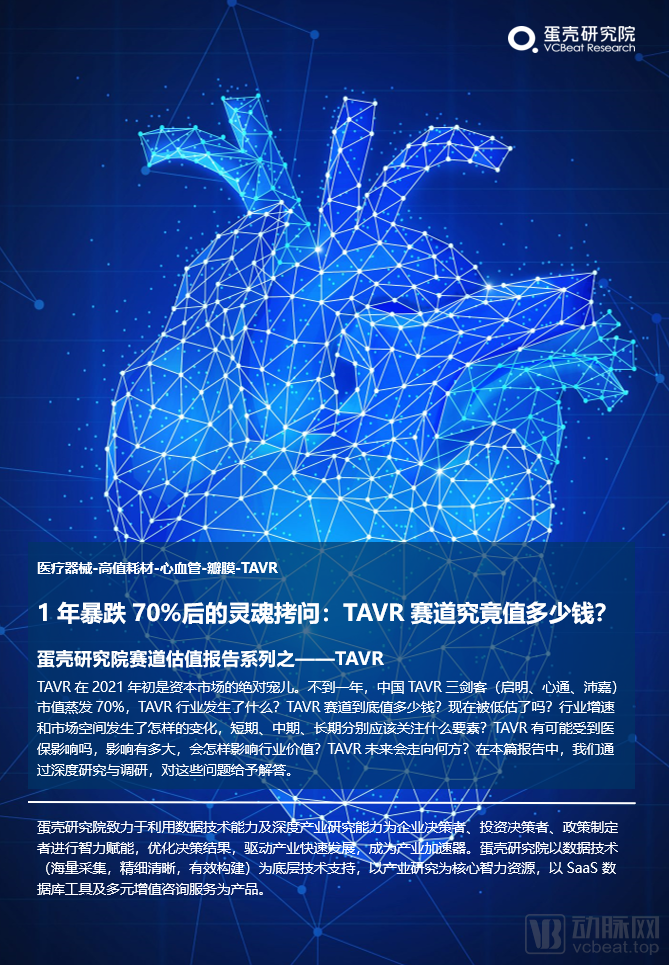 TAVR在2021年初是资本市场的绝对宠儿。不到一年,中国TAVR三剑客(启明、心通、沛嘉)市值蒸发70%,TAVR行业发生了什么?TAVR赛道到底值多少钱?现在被低估了吗?行业增速和市场空间发生了怎样的变化,短期、中期、长期分别应该关注什么要素?TAVR有可能受到医保影响吗,影响有多大,会怎样影响行业价值?TAVR未来会走向何方?在本篇报告中,我们通过深度研究与调研,对这些问题给予解答。