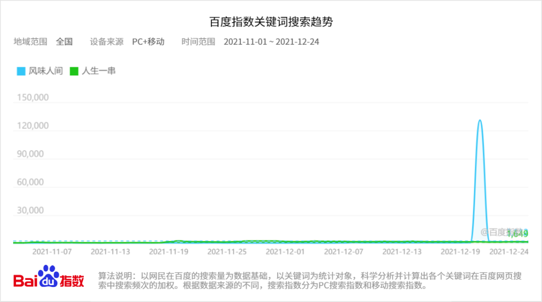 同样是美食纪录片,来对比一下 B 站和鹅家的招牌菜《人生一串》和《风味人间》。如果用百度指数来评价机构媒体和自媒体报道声量,用微博指数来评价社交网络提及声量,可以发现: