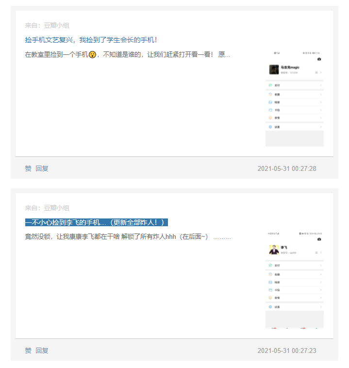 还有“捡手机文学”,起源于豆瓣,玩梗的网友会假装自己捡到一个名人的手机,查看这个人和其他人的聊天记录,只不过这些聊天记录都是网友自己P出来的。