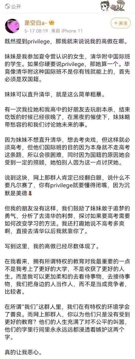 privilege是特权的意思。5月17日,微博用户@是空白a- 用一篇长文讲述自己身边的“特权”教育,开篇就是“既然提到privilege,那我就来说说我的高傲在哪”,文末也不忘点出“写到这里,我的高傲已经尽数体现了”。