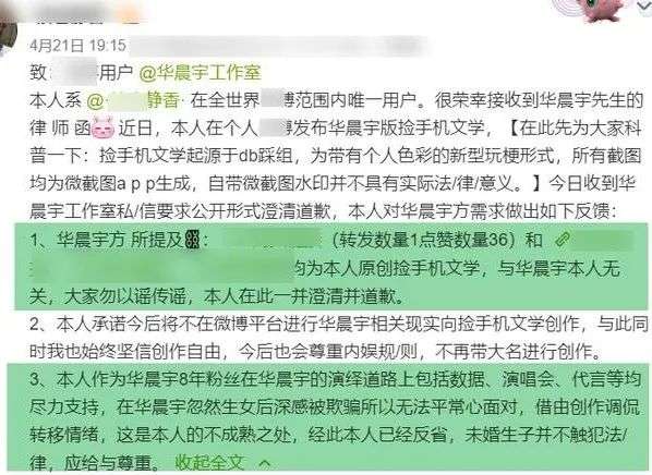 不过,这种“捡手机”的玩法也面临法律风险。华晨宇粉丝就因为创作了关于华晨宇、张碧晨、邓紫棋等人的“捡手机文学”,伪造华晨宇与其他明星的聊天记录,而被自家爱豆起诉了。