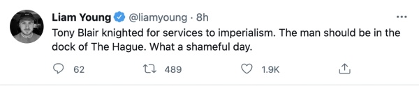英国一政治评论员利亚姆·杨在推特写道:“托尼·布莱尔因对帝国主义的奉献而被封为爵士,这个人应该在海牙(国际法院)的被告席上,多么可耻的一天。” ↓