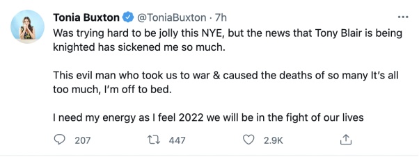 英国一新闻频道“GB News”的主持人托尼亚·巴克斯顿发推称:“本想在新年快乐点的,但托尼·布莱尔被封为爵士的消息让我很难过。这个邪恶的男人把我们带入战争,造成了很多人的死亡。”↓
