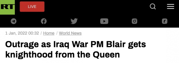 RT称,根据英国2022年新年荣誉榜(New Year Honours list),布莱尔被授予爵士头衔,并获得了嘉德勋章,嘉德勋章是英国的最高勋章,由英国国王爱德华三世于1348年创设。