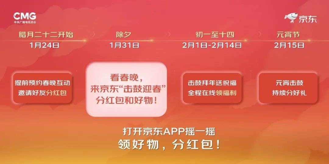央视新闻称,春节期间,京东将发放总价值达15亿元的红包和实物。据介绍,今年的春晚互动将从腊月二十二(1月24日)开始,持续到正月十五(2月15日)。用户可在京东App上,提前预约春晚互动活动,邀请好友共同开启锦鲤宝箱。除夕(1月31日)当天,京东将邀请大家一起“击鼓迎春”,与亲朋好友互动送祝福,分红包好物。