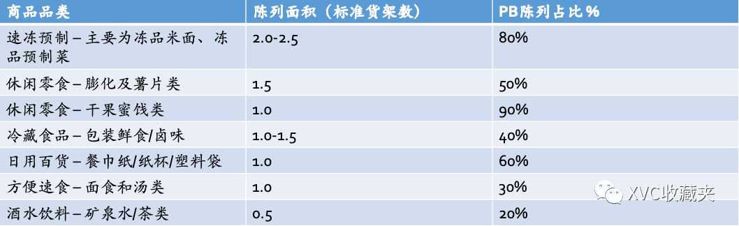我们可以发现,以冻品米面、预制菜为主的速冻预制商品陈列面积比较大,PB商品的占比达到了80%,接下来是膨化及薯片类和干果蜜饯类商品。
