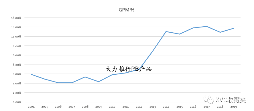 相对应的,我们可以看一下业务超市的综合毛利率走势,从上图我们可以看出,业务超市从大概2009年或2010年开始推广PB产品,从2012年开始PB商品对毛利的影响开始显著的展现出来。从2009年到2019年,11年的时间,业务超市的毛利率增长了近3倍。这让我进一步确认PB商品给神户物产带来了规模优势,让他们在生产环节产生更强的议价能力。