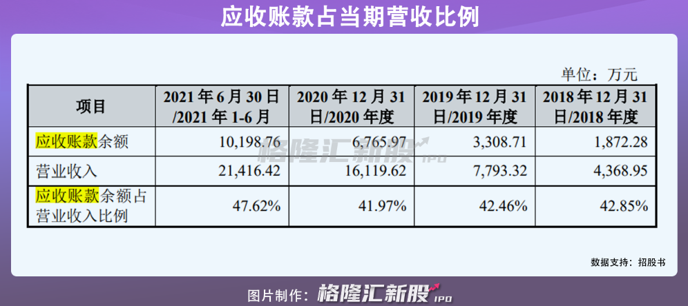 此外,随着营业收入增加,公司应收账款余额走高,报告期各期末,分别为1872万元、3309万元、6766万元、1.02亿元,占当期营业收入比重保持在40%-50%之间,占比较大。