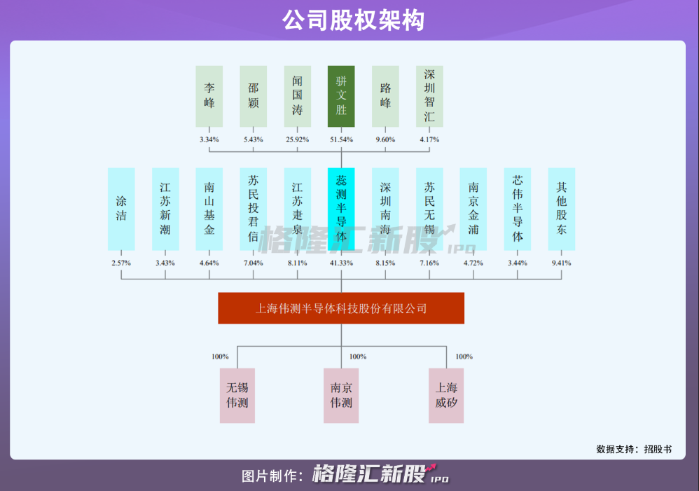 伟测科技成立2016年,由李峰以货币形式出资设立。自成立以来,公司先后开展了10 轮股权融资,引进了同创伟业、东方富海、元禾璞华等投资机构,累计融资近 7 亿元。IPO前,蕊测半导体为其控股股东,持股41.33%。骈文胜通过控制蕊测半导体,成为伟测科技的实际控制人。