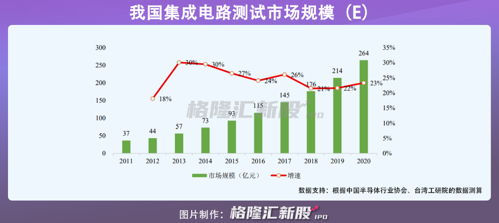 鉴于公司产品主要为内销,报告期内,内销收入占比超过86%,因此仅聚焦到我国集成电路测试行业来看,受益于我国大陆芯片设计业和晶圆制造业的快速发展,带动测试需求扩大,以及中兴、华为禁令事件发生后,为了保障测试服务供应的自主可控,大陆的芯片设计公司逐渐将高端测试订单从中国台湾地区向中国大陆回流,促使国产化替代进程加速下,我国集成电路测试市场规模快速增长,2011年至2020年期间,其市场规模从37亿元增至264亿元,并预计到2025年将达到 550 亿元。