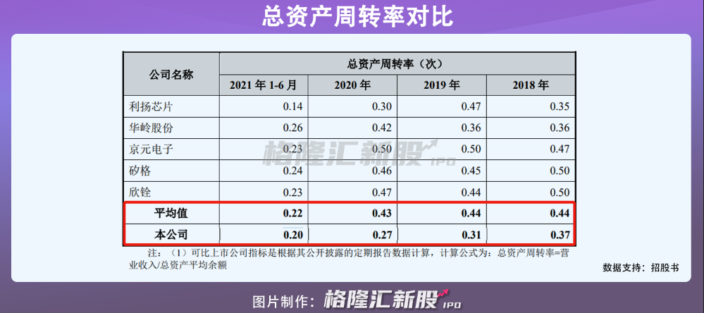 鉴于公司不生产和销售有形产品,其存货主要为周转材料,从总资产周转率来看,因伟测科技收入增长尚处于爬坡期,受产能需求提升,不断扩大生产设备规模,2018年至2021年上半年,其总资产周转率逐年下滑,分别为0.37次、0.31次 、0.27次、0.20次,且低于行业平均值。