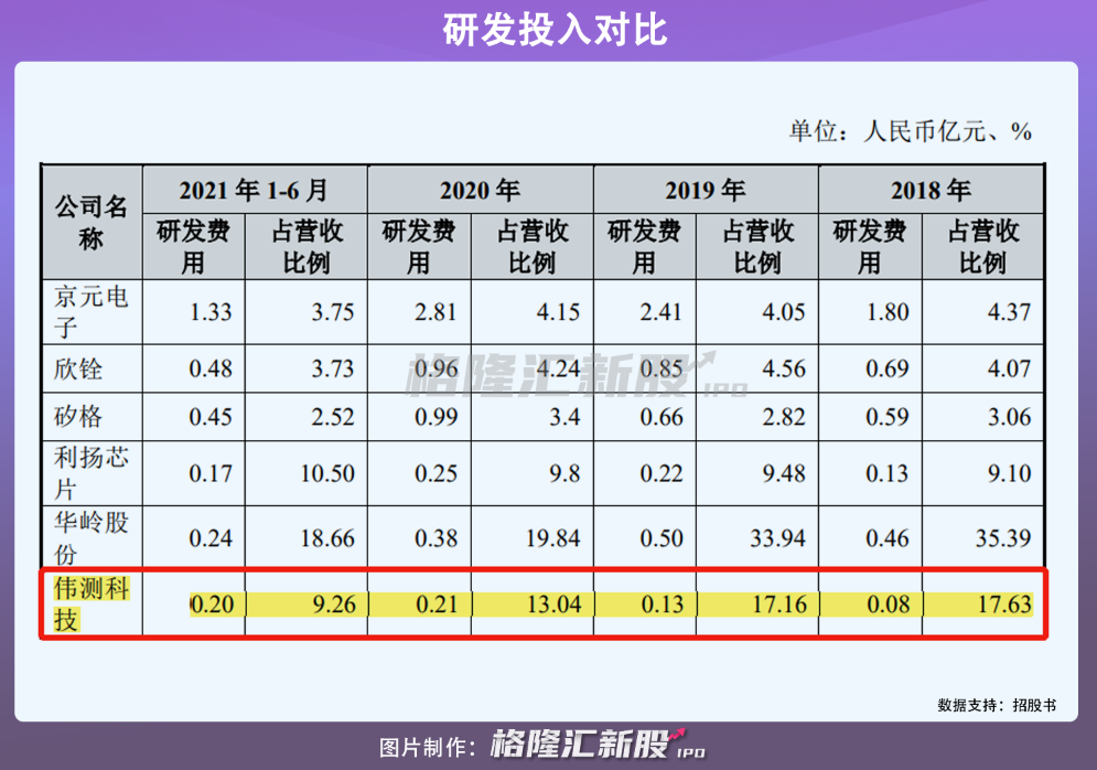 此外,虽然伟测科技在加大研发投入,其研发费用从2018年的770万元增加至2020年2101万元,且与同行业相比,其研发投入占比处于较高水平,2018年至2020年分别为17.63%、17.16 %、13.04%。但是细致来看,公司研发费用低于同行,同时研发投入占比逐年下滑。未来若公司不继续提升研发费用投入,随着红海竞争显现,其或因研发投入不足,导致产品竞争力下降,继而致使市场份额被压缩。