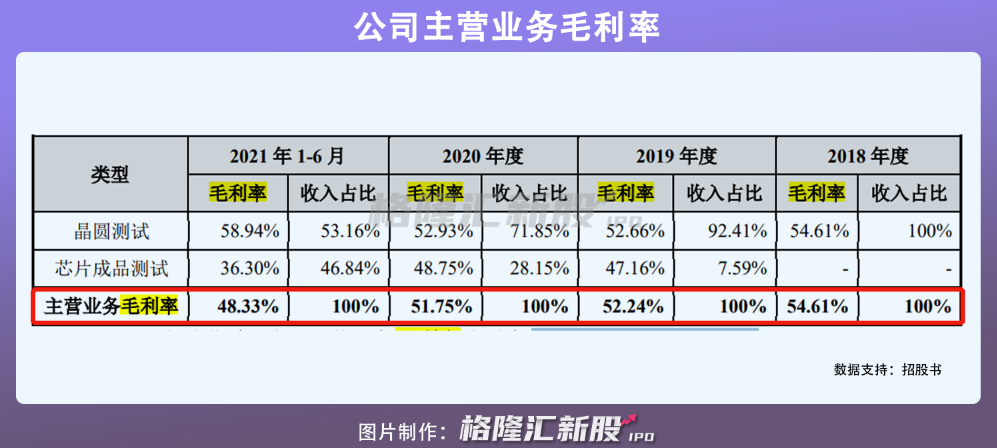 此外,受主营业务毛利率下降影响,伟测科技综合毛利率也略有下滑,分别为54.32%、51.63%、50.58%。