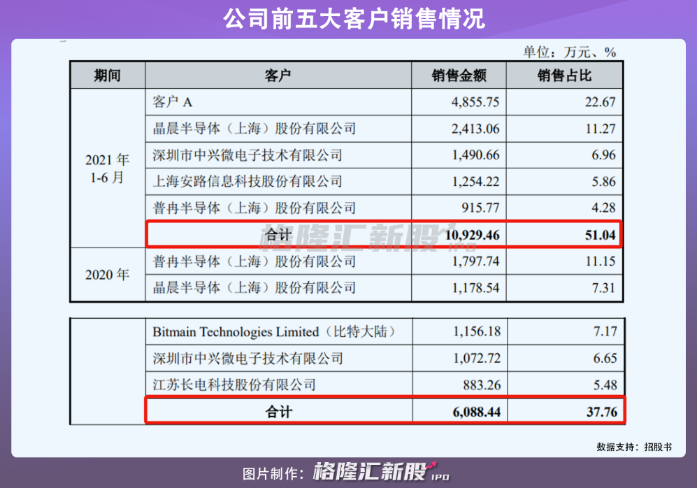 随着销售规模的扩大和客户数量的增加,伟测科技客户集中度在逐年下降,从2018年的56.18%降至2020年的37.76%,但是2021年上半年,因来自客户 A 收入的快速上升,公司客户集中度有所回升,至51.04%,伟测科技一定程度上也存在客户集中度升高的隐忧。
