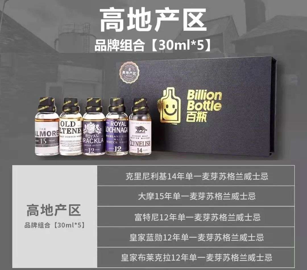 百瓶推出过一系列分享瓶套装,5瓶30ml的威士忌为一组——以品牌为主题,年份不同的威士忌;以产区为主题,来自不同地方的威士忌;也有以橡木桶为主题,风味不同的威士忌。