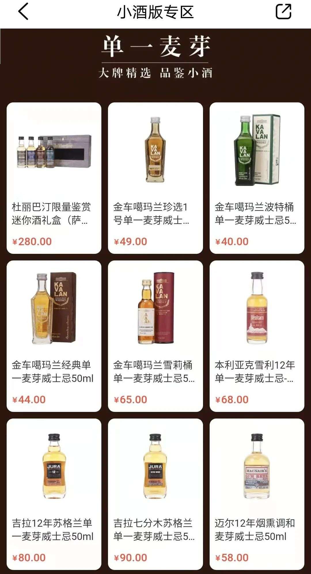 除了分享瓶,还有品牌和酒厂推出小容量的“小酒版”威士忌。所谓“小酒版”,就是指原装酒等比例缩小的版本,其外观、材质、酒液和酒标与原装完全一致,瓶内装有30-50ml的原酒。
