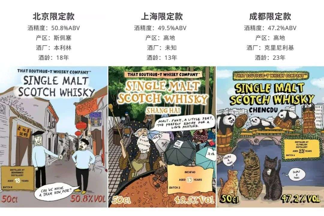 而在「百龄坛」之前,著名的IB品牌——Independent Bottling是指从酒厂选桶自己包装销售的品牌——「TBWC」(That Boutique-y Whisky Company) 就已经在2019年开始用漫画标包装每瓶威士忌。这个牌子甚至还推出过以中国城市为主题的漫画标。