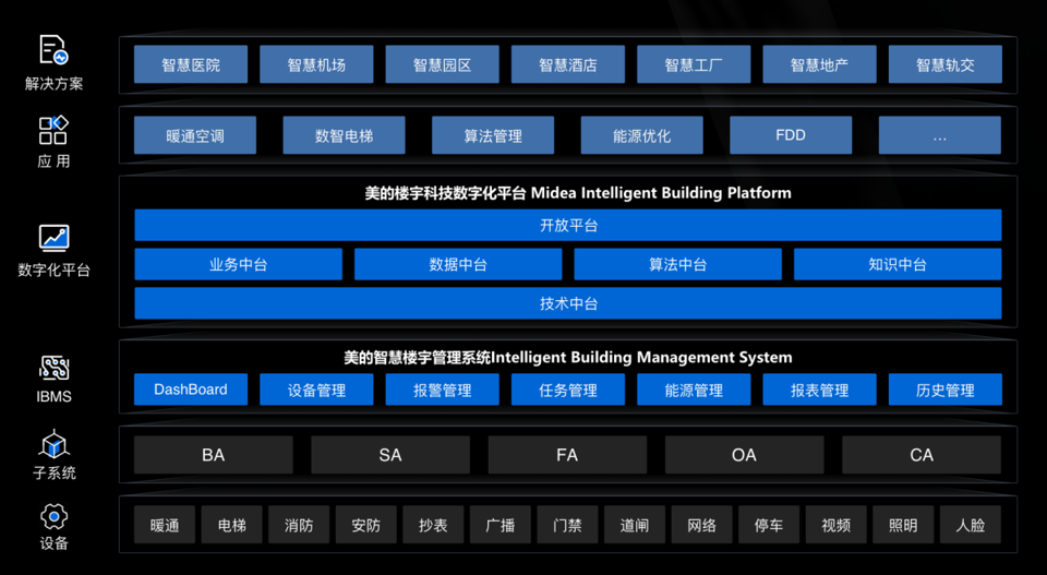 美的楼宇科技数字化平台iBuilding是美的集团通过全面数字化、全面智能化实现内部效率提升和外部用户交互的数智驱动战略在楼宇科技业务板块的重要实践成果,构成了美的楼宇科技数字化战略的平台基础和核心技术架构。在2021楼宇科技TRUE大会上,美的集团副总裁兼楼宇科技事业部总裁管金伟详述《数智融合 - 美的楼宇科技数字化战略》时如是说:“作为智慧楼宇科技综合解决方案供应商,美的楼宇科技的数智融合战略以数字化平台iBuilding为核心,以自有产品及业务为优势,连接其他楼宇生态设备,为包括智慧轨交、智慧医院等在内的行业多维应用场景提供价值赋能,构建面向楼宇生态交通流、信息流、体验流和能源流的完整端到端解决方案,高品质输出一种低碳、安全、智能且高效的用户体验。数智融合战略全面覆盖了解决方案数智化、服务数智化、产品数智化、流程/体系数字化和制造数智化等五大板块,将助力美的楼宇科技实现对内的全链路业务运营数字化目标和对外的全场景解决方案数字化目标。”