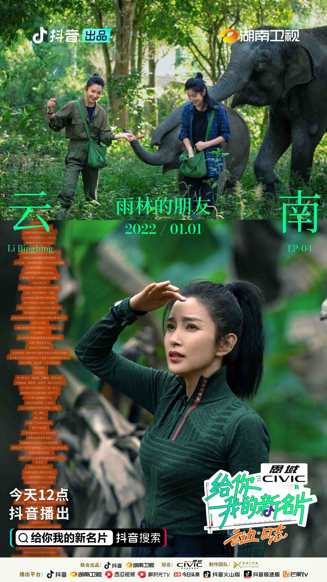由抖音出品创新定制综艺,联合湖南卫视播出的《给你,我的新名片》第二季《云边·日志》第四期已于1月8日中午12点正式上线。既体验过“象爸爸”的一天后,李冰冰又深入雨林,开启了一次新鲜的追象之旅。