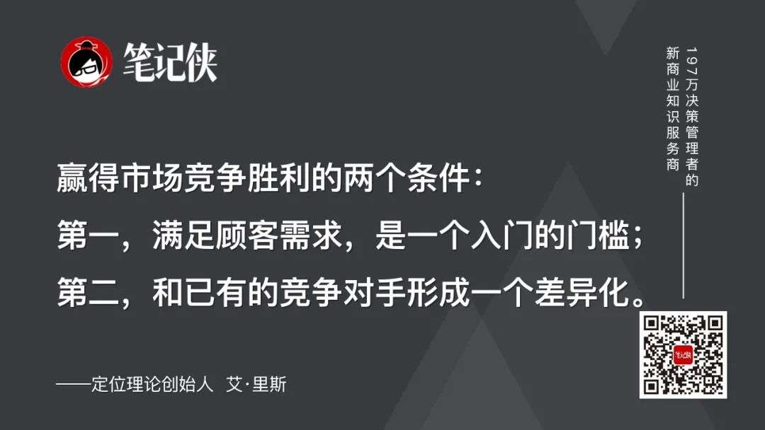 想要赢得市场竞争的胜利,需要两个条件:第一,满足顾客需求,是一个入门的门槛;第二,和已有的竞争对手形成一个差异化。