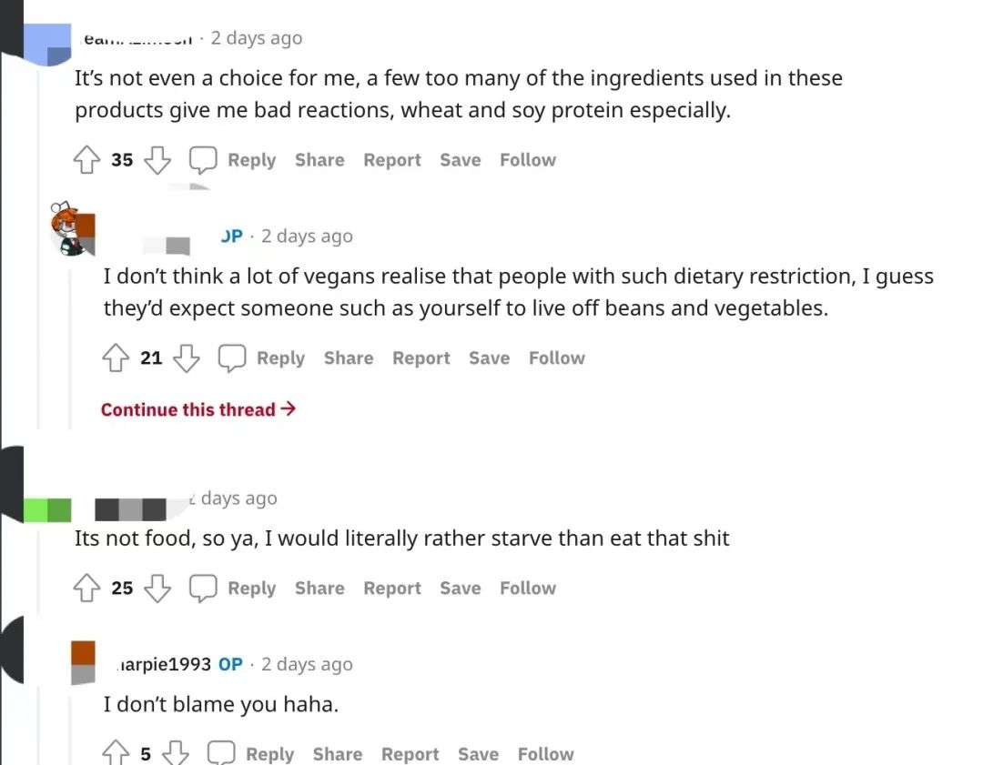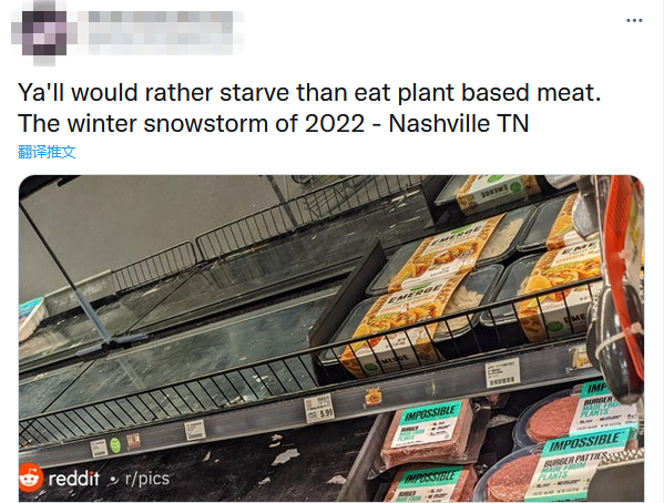 据新闻报道,在当地时间8日,国外知名论坛Reddit上有人分享了一个有意思的帖子,“暴风雪天气下,你会宁愿饿死也不吃人造肉。”。