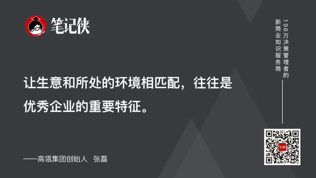 5.在商业系统中,没有一种放之四海而皆准的成功范式,不同的企业凭借独门招式赢得生存及发展空间,有的靠品牌,有的靠产品,有的靠管理,有的甚至靠时运。但无论凭借什么,让生意和所处的环境相匹配,往往是优秀企业的重要特征。