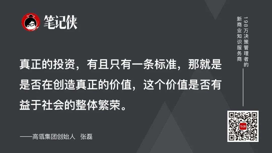 3.真正的投资,有且只有一条标准,那就是是否在创造真正的价值,这个价值是否有益于社会的整体繁荣。坚持了这个标准,时间和社会一定会给予奖励,而且往往是持续、巨大的奖励。