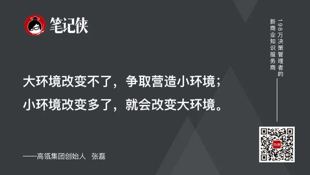 4.在未来的商业逻辑中,企业从求赢变成不断追求新的生长空间,从线性思考变成立体思维,从静态博弈变成动态共生。企业的护城河也不再用宽窄或者深浅来描述,而是用动态的视角,从趋势这个角度加以评定。