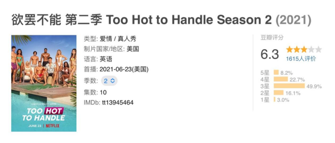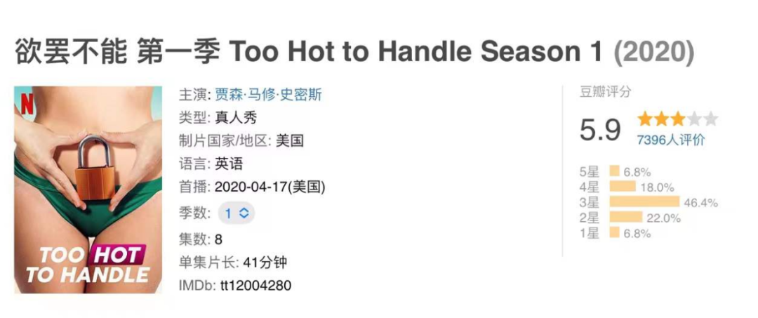 《单身即地狱》严格来说并非原创,美国Netflix于2020、2021年分两季推出的真人秀《Too Hot to Handle(欲罢不能)》已开“荒岛求生”式的恋爱综艺先河。