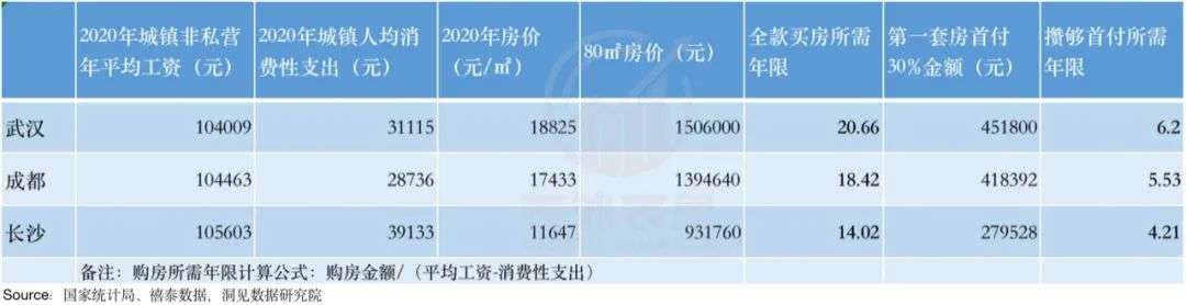如此一来,在极度节约且祈祷房价不涨的前提下,在长沙全款买房需要14年,成都18年,武汉则是21年。