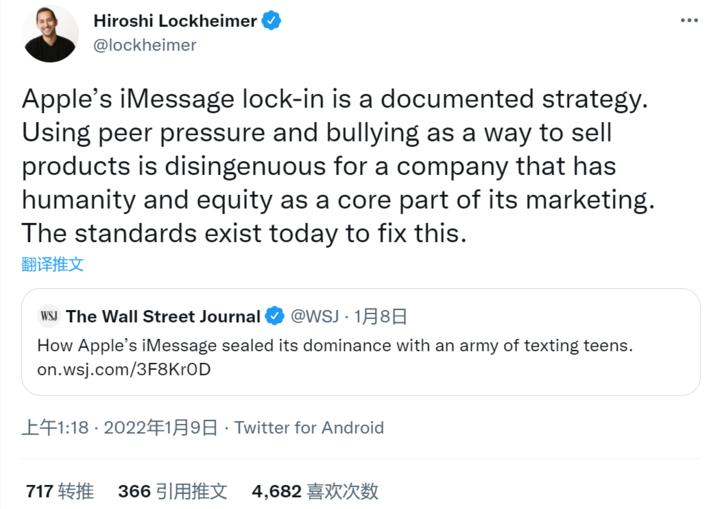 Google 高级副总裁 Hiroshi Lockheimer 认为,iMessage 的封闭环境是苹果的一种商业策略,而这种利用同辈压力甚至是霸凌来销售产品的行为,对于苹果这种将人性和公平视为营销核心的公司而言并不真诚。