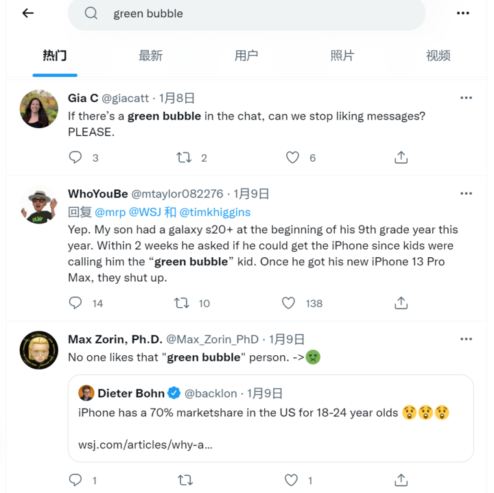 这并非个例,只要在 Twitter 上搜索「green bubble」相关的关键词,就能看到成百上千条关于「绿色气泡」的吐槽。