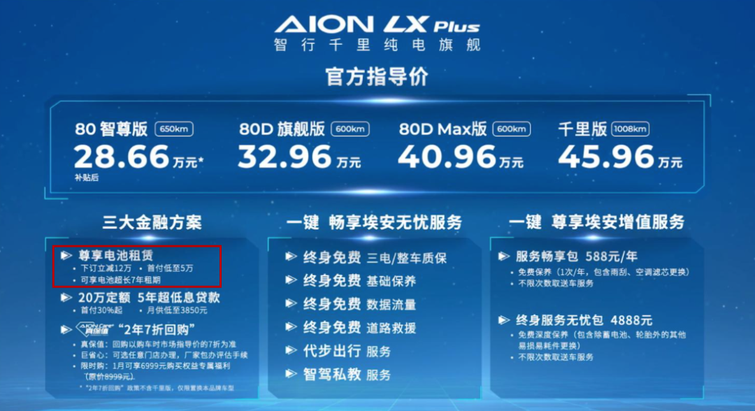 所以,广汽埃安的电池租赁方案,本质上是一种有首付的电池贷款方案,只是厂家没有把电池的首付放在明面上,而是悄咪咪隐藏在了车身首付中,这样就会给消费者一种“电池租赁方案更划算”的错觉。