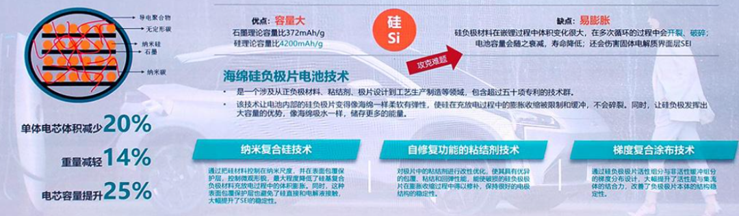 例如刚刚上市的AION LX PLUS千里版,其搭载的广汽自主研发的“海绵硅负极片锂电池”(跟广汽集团一年前发布的石墨烯电池是两回事),就是通过负极材料创新,实现了能量密度的提升。