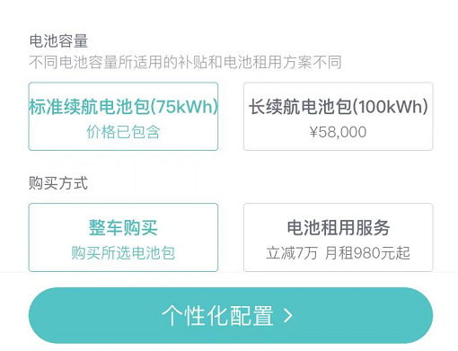 而在蔚来App订车页面,目前也确实无法选择150度固态电池包,只有75度和100度的普通电池包可选。
