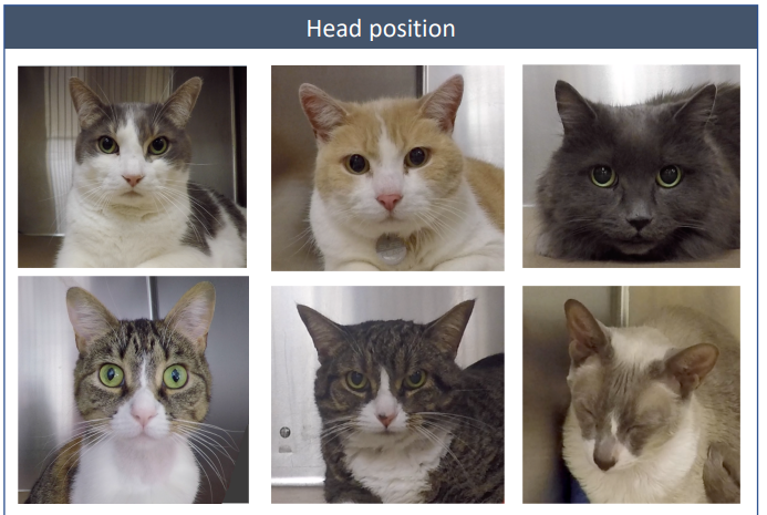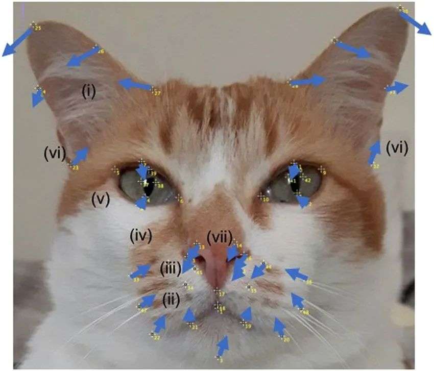 通过比较猫咪在无疼痛、中等疼痛和剧烈疼痛条件下的表情差异,斯蒂高尔和同事们建立五个和疼痛相关的面部特征(动作单元),即耳朵位置、眼周紧张程度、口鼻部紧张程度、胡须的变化,以及头部相对肩线的位置。至此,人类在读懂猫脸的征程上算是有了些许作为。