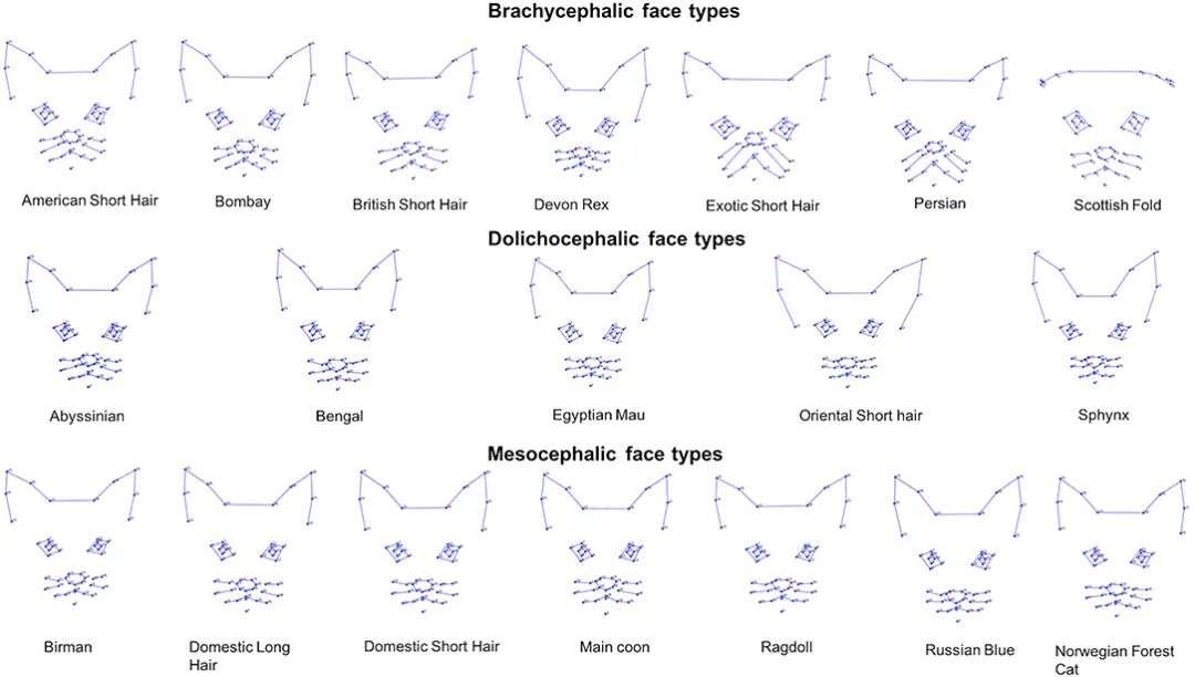 研究者对短头(第一行)、长头(第二行)、中头(第三行)型的共19个品种猫构建的几何线框模型。右上角这三只是真好认啊。