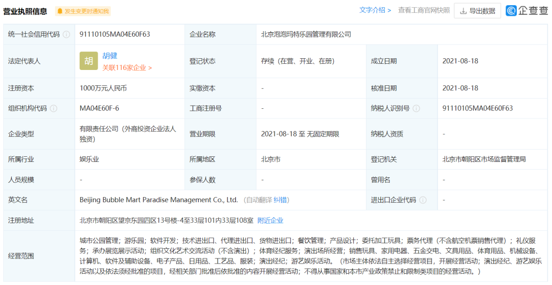早在2021年8月份,泡泡玛特注册成立了北京泡泡玛特乐园管理有限公司,注册资金为1000万元,其主营业务包含了城市公园管理、游乐园、游艺娱乐活动等,被视为泡泡玛特入局主题乐园市场的正式官宣。而之所以有资本可以进入这一领域,也是基于其鲜明的IP属性,相关资料显示,泡泡玛特共运营有93个IP,其中包括Molly、Dimoo等12个自有IP,以及PUCKY、The Monsters等25个独家IP。