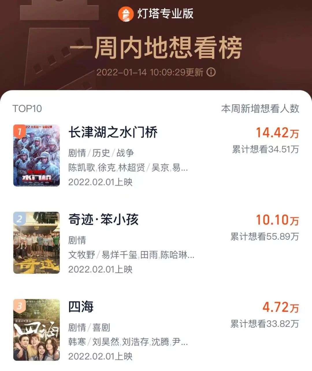 由于预售尚未开启,目前对春节档观影热情的最主要判断依据还是来自于想看指数。截至毒眸发稿前,灯塔专业版公布的想看指数中,《奇迹·笨小孩》以56.3万排名第一,《水门桥》以35.8万排名第二,《四海》以34.1万排名第三,全面领先其他影片,第一梯队已经成型。