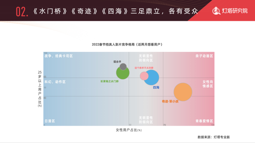 《水门桥》由于紧急定档的因素,因此想看指数暂时未能达到第一。但在昨日正式官宣定档消息后,《水门桥》的单日新增在看数达到了10.4万,高出第二名7.1万,增速迅猛。且据灯塔分析师所述,男性用户在点击想看按钮上的意愿相对较低。而《水门桥》的想看用户性别占比更偏向于男性,《奇迹·笨小孩》的想看用户性别占比更偏向于女性,而《四海》则更多处于中间地带。因此,《水门桥》的实际观影热情相对于目前可见的想看指数而言,会更上一层楼。