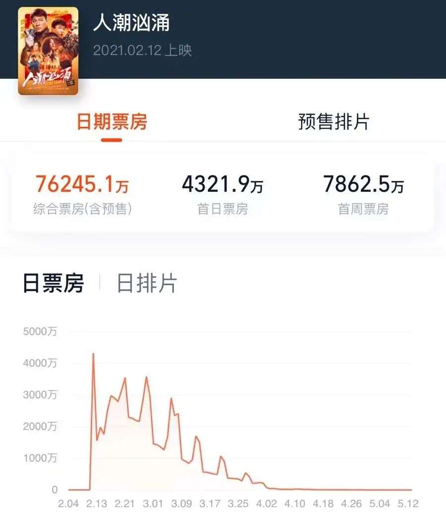 因此,如果春节档《水门桥》复制这样的走势,档期内其他片子想要逆袭到头部位置相当困难。但走出档期,面对二月三月的广阔市场,其余影片的增长空间很大。从去年春节档开始,春节档结束后的档期长尾效应愈发明显(点此阅读:二月票房大丰收,三月院线没片看),这让一些口碑尚佳的影片即便在档期内遭遇排片困难,但到了档期外也能获得不错的票房走势。比如去年春节档豆瓣评分第一的《人潮汹涌》,其在大年初一上映时票房排名垫底,但在上映第八天时跃居单日票房第四。最终,其在春节档档期内仅收获1.5亿票房,但走出春节档后最终共报收7.62亿。