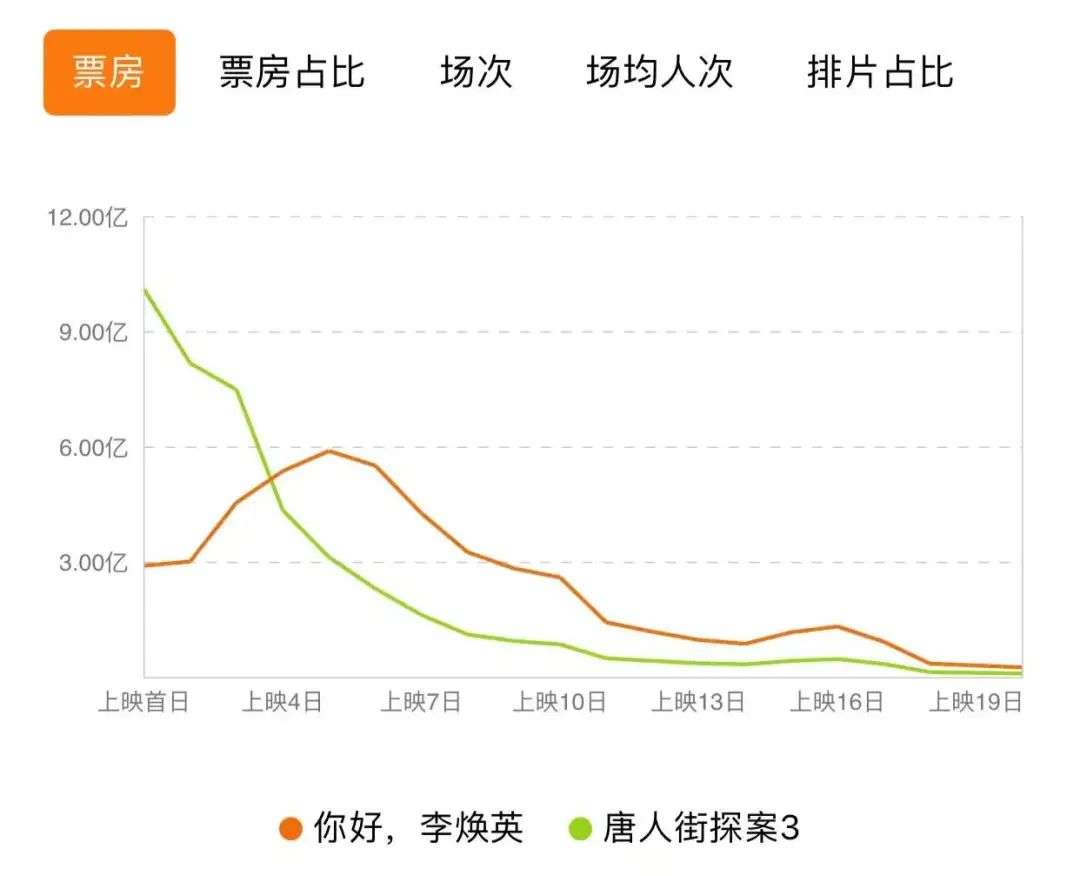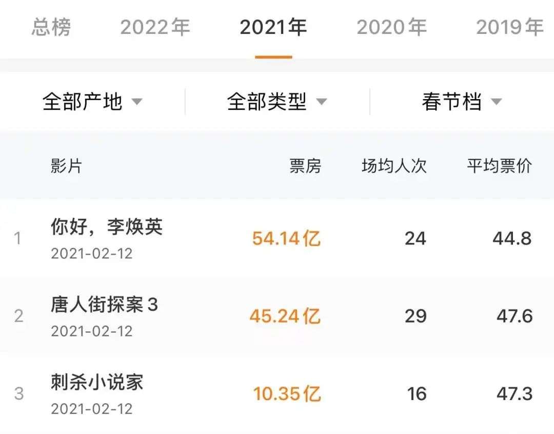 过去多年的春节档总有一个“魔咒”:映前热度和预售最高的片子,有很大的概率保不住冠军地位。比如去年的《唐人街探案3》,首日票房超10亿,是第二名的《你好!李焕英》的3倍有余,但从大年初四开始,单日票房便遭到了反超。