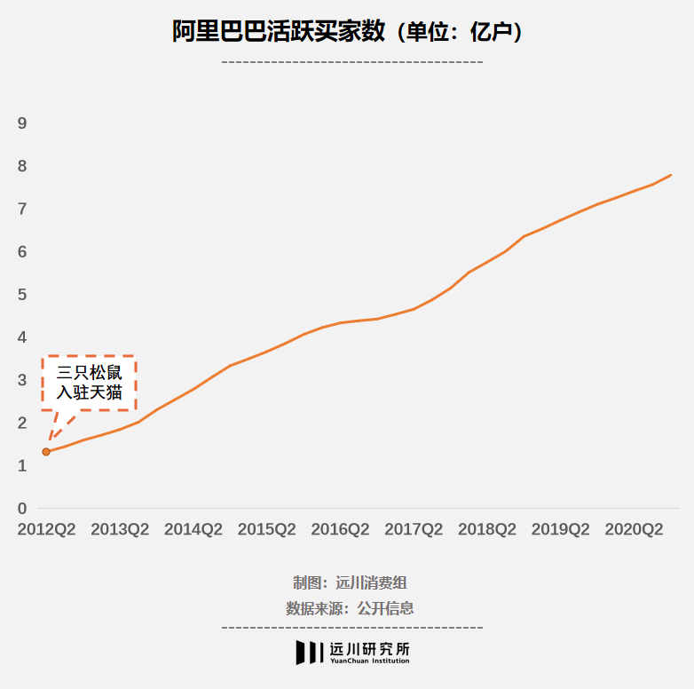 2012年,“淘宝商城”改名天猫,活跃买家数就像乘上了火箭,连续三年增速超过40%[5],还恰逢淘宝从C店往B店大量导流。
